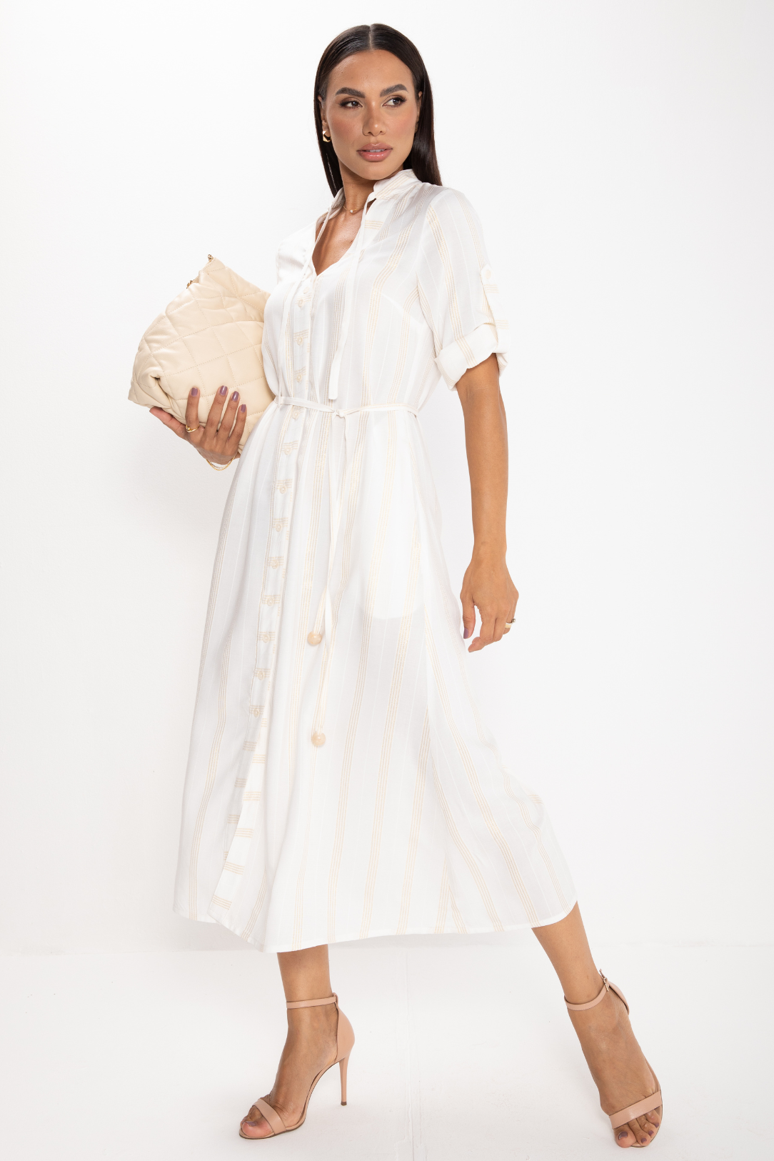 2. Corte Clássico, Elegância Atemporal: Admire o corte clássico dos nossos vestidos chemise, proporcionando uma elegância atemporal. Estas peças são uma adição indispensável ao guarda-roupa de mulheres modernas que valorizam o equilíbrio entre moda e tradição.